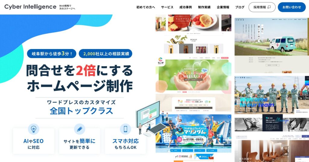 株式会社サイバーインテリジェンスは、ホームページ制作を中心にSEO対策・広告運用などを得意とするWebマーケティング会社です。過去に2,000社以上の相談実績を持ち、「成功事例」では、お問い合わせ数を10倍以上に増やした実績も掲載されています。